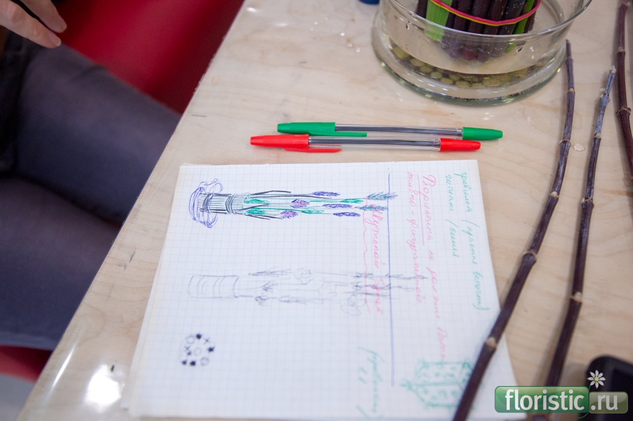 Юрий объясняет некоторые приемы творчества. И на глазах из невнятных линий рождаются идеи по-настоящему креативных букетов.
