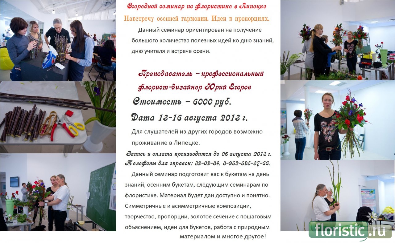 Преподаватель – профессиональный флорист-дизайнер Юрий Егоров. Стоимость – 6000 руб. 13-16 августа 2013 г.