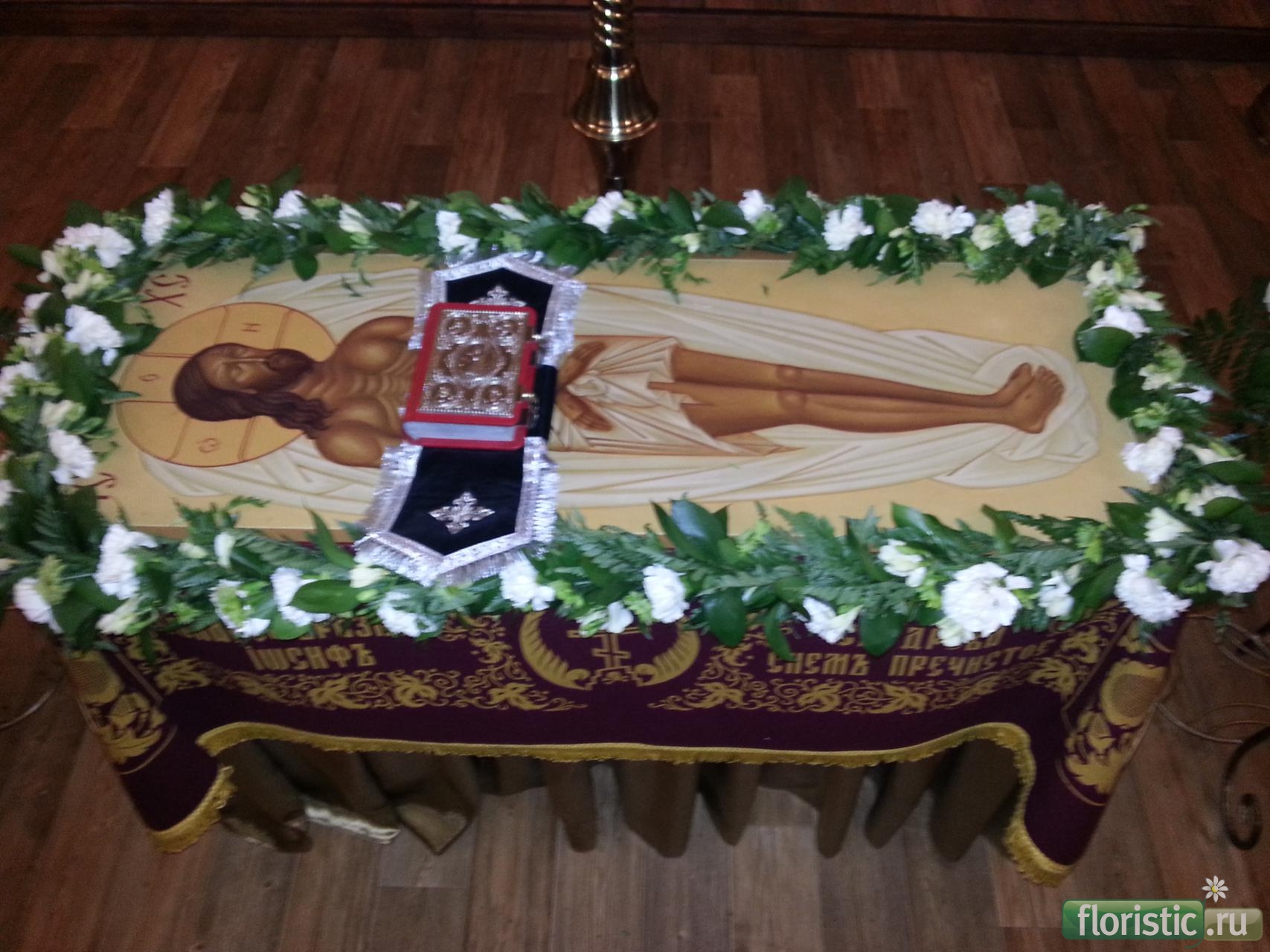 Христос воскресе! Я по-прежнему не участвую в непосредственном цветочном украшении. . Только консультирую и предлагаю варианты оформления. . Правда, на этот раз, т.к. из-за измененных царских врат не возможно было использование прежней арки, я предложила сделать две: над иконами Спасителя и Богородицы и, поскольку, наш флорист Марина была очень занята, то взяла впервые в руки лобзик и дрель и сделала основы арок для крепления оазиса ( чем была несказанно горда - грех мой). Вот что в итоге у нас получилось. Плащаница.