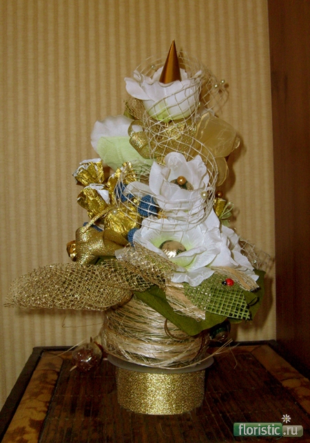 И от себя добавлю... Конфетка находится в серединке цветка. Розочки из креповой бумаги, конусы из металлизированной пленки