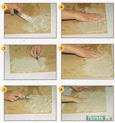 Техника лепки предполагает работу с самим раствором, создание форм-предметов руками, без дополнительного материала. Раствор-основа отличается пластичностью, которая позволяет создавать объемные изображения. На нанесенную основу накладываются дополнительные порции раствора и формируют задуманную форму. При составлении композиций используеются различные растения: листья, цветы, кору, ветки, ягоды и т. д. В коллажах "терра" природный материал не приклеивается к основе, а закрепляется с помощью раствора. Работать с природными элементами нужно очень осторожно, чтобы сохранить фактуру листа или цветка, поскольку раствор скрадывает рельеф материала. Если залить их раствором, работа станет беднее, лишится выразительности, живости. Поэтому пользуются техникой вдавливания, которая требует особой аккуратности, тщательности, опыта. Интересные узоры, фактуры, рельефы легко создавать, используя технику оттиска. Подойдут разнообразные твердые материалы, которые можно зафиксировать, вдавив в раствор: и макаронные изделия, и сухие ягоды, к крупы, и косточки, и фасоль. Поскольку этот материал содержит влагу или легко ее впитывает из влажной основы, после высыхания он легко выпадает, оставляя очень интересный рельефный рисунок. Коллажам "терра" подходят рамы со сложным рельефом. В то же время багет не должен отвлекать от самой работы, скоре обязан подчеркнуть достоинства и индивидуальность композиции. источник: http://igrushka.kz/vip75/terra.php |