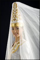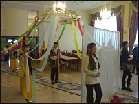 С утра к дому невесты подъезжает свадебный кортеж. Его уже ждут невестки и сестры девушки. После шутливых дебатов друг жениха платит выкуп или просто угощает родственниц сладостями. Но это только первый барьер, впереди жениха ждут два кордона из младших братьев и подружек невесты. Плюс ко всему старшие снохи выворачивают у влюбленного джигита карманы пиджака, где должны лежать всякие безделушки. Невеста выкуплена, гости пробуют еду с дастархана, а свадебный кортеж под шашу направляется в мечеть, где совершается мусульманское бракосочетание. После уже – в загс, где, кстати, недавно ввели новую традицию – вручают молодоженам керамическую юрту с зажженным внутри огнем. Обычно после бракосочетания молодожены едут поклониться какому-нибудь святому месту. А после, классическая прогулка – местные парки, площади и другие достопримечательности. Свадьба начинается с пения традиционной песни ”Жар-жар”. После проводится обряд ”Бет-ашар” – выглядит он так: снохи выводят невесту под руки в зал, где ее с песнями-наставлениями встречает домбрист. Невеста находится за импровизированным шаныраком . Потом он начинает перечислять родственников жениха, и девушка в знак почтения отдает каждому поклон. Те, чьи имена назвал домбрист, обязаны положить деньги на стоящее перед тамадой блюдо. В конце песни невесте открывают лицо, на этом обряд заканчивается – жених с невестой и все гости рассаживаются по местам – начинается праздник. Через некоторое время после свадьбы родственников новобрачной приглашают к себе в гости родители жениха. Называется этот обряд есик тор (почетное отворение дверей). Здесь, как всегда, традиционные бата, бешбармак. Кроме того, родители молодой жены привозят с собой приданое. Его собирает мать новобрачной при помощи родственников. Каждый вносит свою лепту, будь то одеяло, сервиз или просто кастрюля. Идея состоит в том, что молодая жена должна прийти в новый дом со своим имуществом. На этом свадебные гулянья не заканчиваются, еще долгое время молодоженов будут приглашать в гости разные родственники, кормить бешбармаком и вручать подарки за первое посещение их дома в качестве новой семьи… На первой фотографии идет репетиция перед свадьбой, девушки в национальных костюмах держат стилизованный шанырак -круговое навершие купола казахской юрты; на второй фотографии держат полотно ткани, за ним будет стоять невеста. На третьей фотографии изображен момент, когда невесте открывают лицо, и она пойдет с женихом по белой дорожке к свадебному столу. Это очень красивая традиция. |