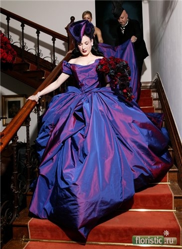 Посмотрите в инете про готическую свадьбу. Можно сделать гламелию перемешивая красные лепестки роз с более черными, или черной органзой...можно в букет вставить декор черного цвета ( корелиус, проволока черная алюминевая, стеклярусы черные и т.п.)... для меня этот заказ был бы полетом фантазии, прям завидую вам))), удачи!!!