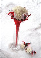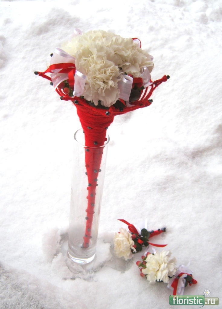 Девочки, спасибо за высокую оценку работы, но это и в самом деле был супербюджет, просто мы взяли деньги только за цветы, т.е. стоимость 5 гвоздик+2 веток гиперикума. Свадьба была уж очень необычная. Молодожены - друзья моих детей, жених - без обеих ног, невеста - 20-летняя, как ребенок маленькая, худенькая брюнетка. Хотелось сделать что-то очень теплое и нестандартное для нее. У нее - красное платье, а жених был в красной рубахе и костюме графитового цвета. Так что бывают и такие истории =)