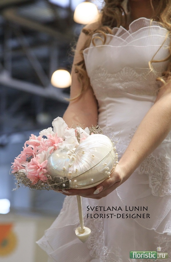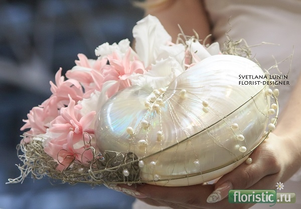 Следующая идея - использование натуральной полированной раковины наутилуса. Эти раковины - одна из моих многочисленных слабостей, в этом букете я нашла способ закрепить эту раковину без клея или любых других повреждений в горизонтальном положении. Обычно эти раковины используют иначе -см. свадебные лайф-3 и т.д. Кроме натурального жемчуга компанию раковине составили нежнейшие стабилизированные каттлеи и туберозы. обучение - http://svetlana-lunin.com/ группы курсов - в ВК и в ФБ флористический блог - http://svetlana-flowerart.blogspot.co.il |
