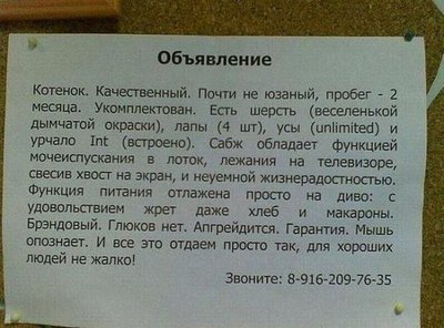 Мол помогите пристроить злому Модератору добрых котят ! А кстати ихняя мать жива ? Если людям далековато ехать, возможна ли " доставка на дом" ? И еще на мой взгляд в обьявлении катастрофически не хватает номера телефона для обратной связи. |
