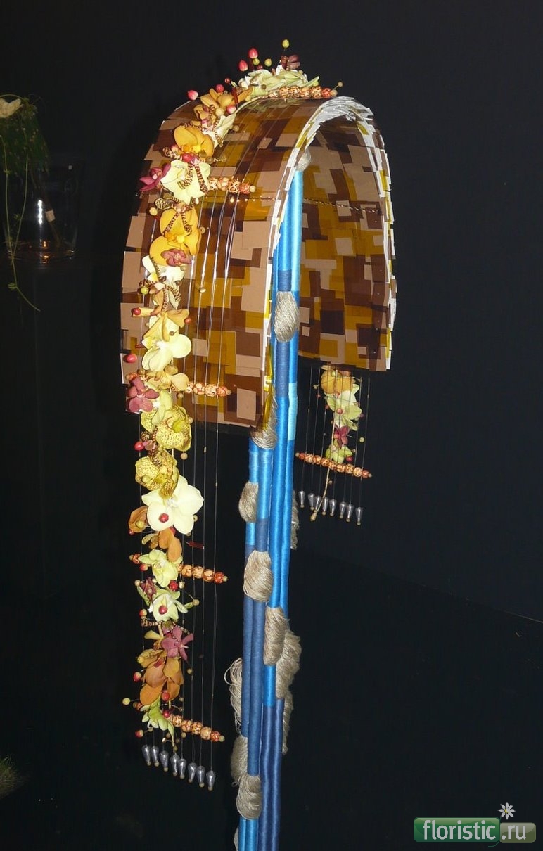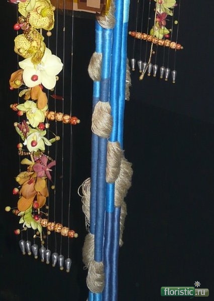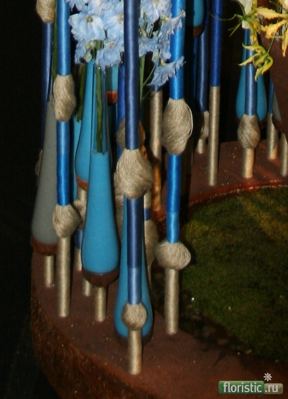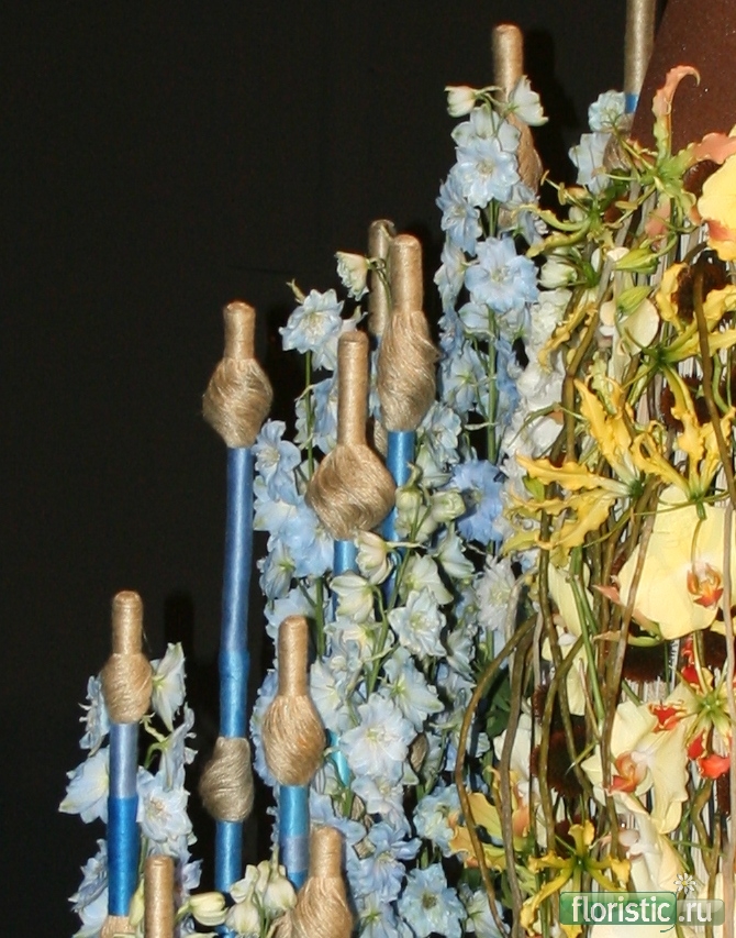 Первое задание - с теми же нежно голубыми дельфиниумами,которые были у Паши Черняка - действительно,настолько завораживающий цвет... сожалению,особо много фотографий не было. Фото Туана - хорошо сняты,но у меня - в минимальной резолюции,следовательно,вытащить из них почти ничего нельзя. А когда снимал Араик,уже все толпились,часть работы в тени,вечером... Короче,увеличиваю все,что только можно. Рядом с работой - в рамках - эскизы самогои Вячеслава к этим самым работам. Учитывая тему задания - Я такой - довольно яркая деталь.)))))) Сама работа выполнена очень интересно и содержит много идей. Вокруг - стойки,сами стойки обмотаны нитью или шнуром,в некоторых местах есть такие декоративные элементы из шнура другого цвета,которые практически повторяют форму колб,заполненными голубым порошковым пиафлором и служащими для питания цветов.Колбы в разных уровнях,что позволило поднять дельфиниумы довольно высоко,создав форму ниспадающей спирали. На центральной стойке - такая торпеда - нижняя и верхняя часть ,наверное,цветной,коричневый пиафлор. Центр - нежно желтые фаленопсисы и глориоза оранжевого оттенка на основе из прутьев(?). Ну,в общем,лучше один раз увидеть...))))))) обучение - http://svetlana-lunin.com/ группы курсов - в ВК и в ФБ флористический блог - http://svetlana-flowerart.blogspot.co.il |