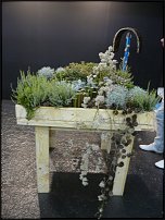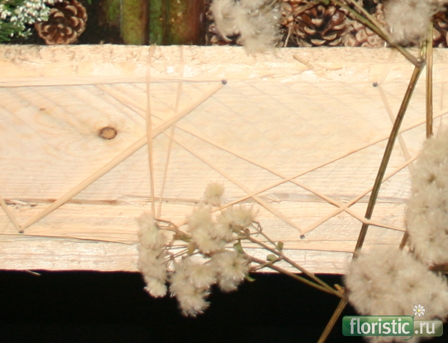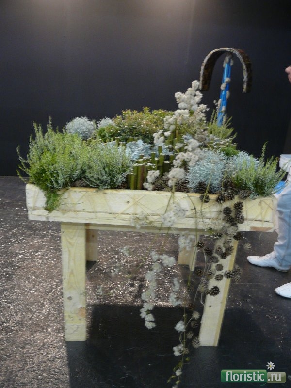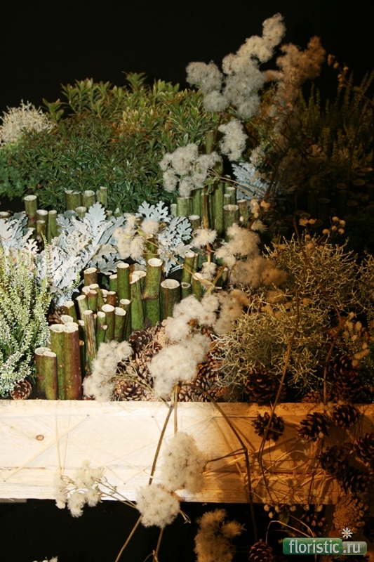 Второе задание,за которое Слава получил первое место! Упасть в Арденны - композиция из горшечных. На мой взгляд,больше передает ощущение дикой природы... То,что удалось рассмотреть - оригинальная заготовка под крепление ниспадающих частей композиции - по всем сторонам стола - из рафии и гвоздей,так что сождается скорее ощущение декора,а не иехнической детали. Тем более,что рафия почти не видна на фоне сосновой доски. Деление на зоны внутри композиции...