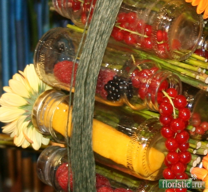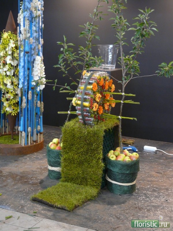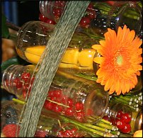 Следующее задание - вечеринка в Лимбурге - идея не менее оригинальна,чем у победителя. Скорее я бы сказала - это Поедем на вечеринку...)))))) Из все тех же бутылочек из-под сока сделано колесо,закрепленное на двух стоящих по бокам деревцах(их Слава пригрузил яблоками). Между бутылочками - палочки,в бутылочках - ягоды и герберы в "пальчиках" цветного пиафлора. Из ящиков,наверное,ступенька...Фотографий нет много...что есть - увеличиваю детали.