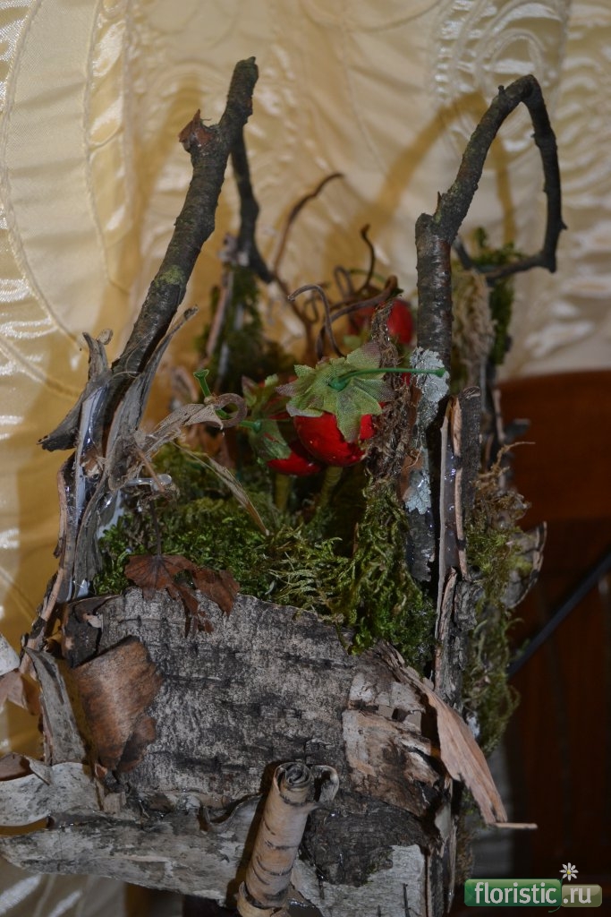 Даже не знаю куда определить свою сумочку, пусть будет здесь. Делала как пробный вариант, картон, мох, кора, внутри оазис. Вот думаю на работу отвезти, и сделать её с живыми цветами, клубнички воткнула только для того, чтоб пустой не была.