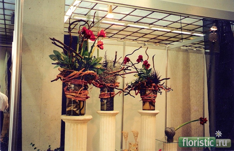 Сберегающие пространство обувные коробки, некоторые заполненные цимбидиумом. ![]() Шаг 9 Растительная аранжировка, центром которой стала виноградная лоза, из эуфорбии, гиппеаструма, скиммии, орхидеи ванды, листьев бадана и хвои кипарисовика. ![]() Шаг 10 Мини-букетики в стройных вазах из гиппеаструма, скиммии в воротничках из листьев антуриума. ![]() |