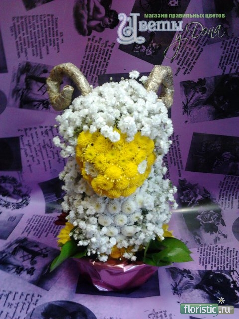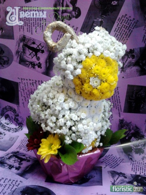 Использован сухоцвет лагурус. Только отдельную тему с этим вопросом создавать не стоило - всё есть здесь "Зверюшки из цветов" http://www.floristic.ru/forum/showth...=1491&page=107