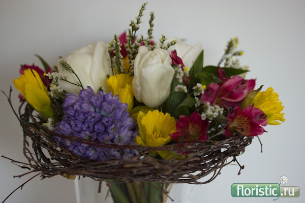 Обязательно сфотографирую в следующий раз! А сейчас прошу: пожалуйста, разберите этот букет. Справа - делала вечером, а утром добавила гиацинты.