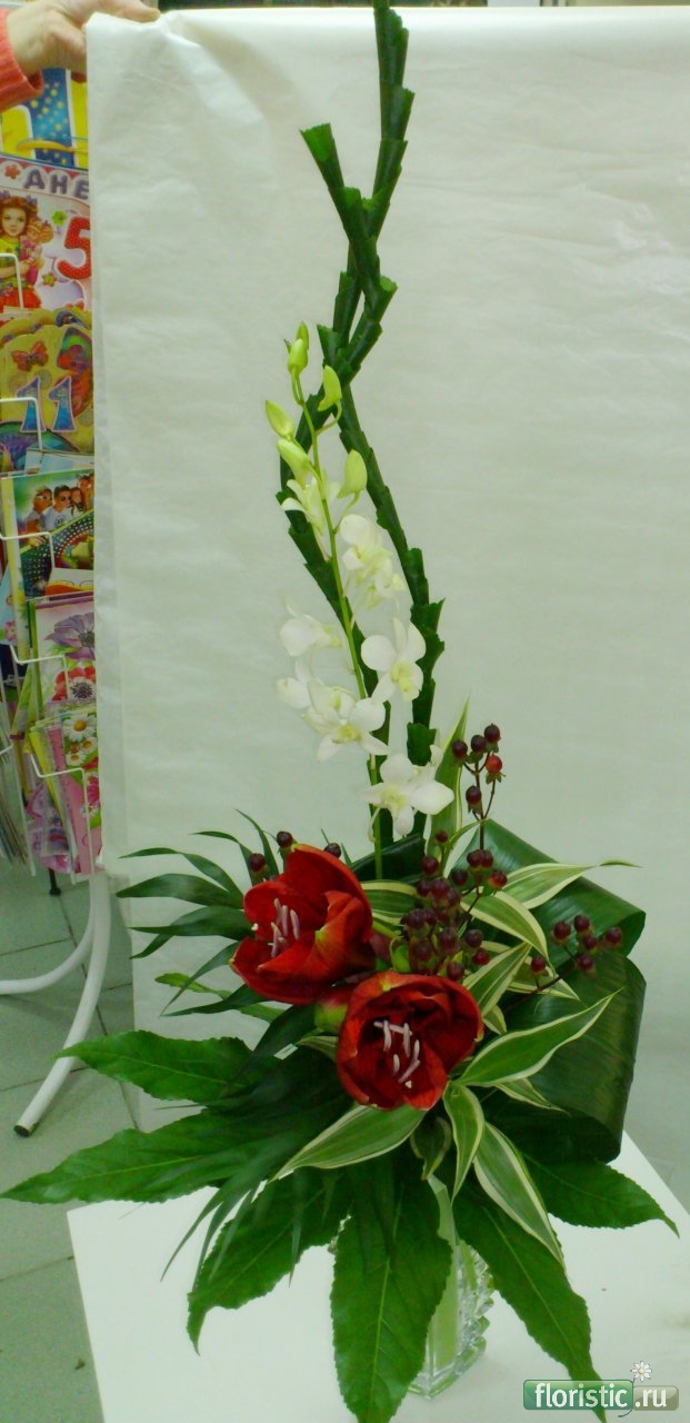 Оранжевое-крокосмия, листья-кордилина. Хотелось именно графичности и чётких линий, поэтому не добавляла никаких мелких элементов. Очень люблю амариллис, но всегда мучаюсь: с чем его поставить вместе. Завтра сделаю и выложу ещё один вариант( тот по крайней мере стабильно продаётся).