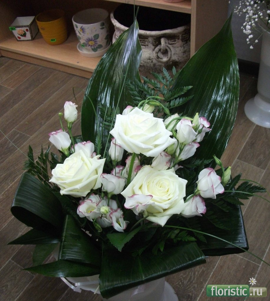 Здравствуйте! Смешно, конечно, выкладывать свои "заячьи уши" (так я окрестила свой букет) после ваших работ такого уровня...но, так как спросить совета мне больше не у кого, учусь сейчас флористике сама (курсов было недостаточно), только начинаю работу...хочу услышать ваше мнение - какие здесь принципиальные ошибки? хотелось сделать букет в бело-зеленой гамме. но белых цветов оказалось вот только три розы и лизиантус..да и с зеленью проблемы с наличием. что бы можно было добавить сюда еще, и что может быть убрать? Спасибо! п.с. прошу прощения за фон.