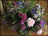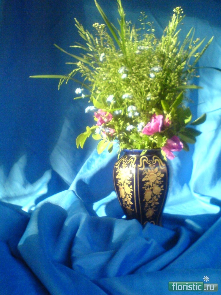 Размер букета выдержан......форма букета хорошо подходит к форме вазы, цветовое решение хорошее, а вот содержание букета , я имею ввиду цветы подошли бы лучше к глине, на мой вкус пусть ваза была бы просто синей, но когда отделано золотом)))).....роз букету не хватает....!