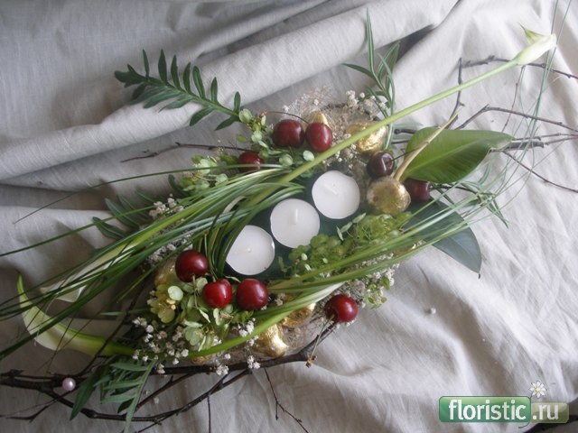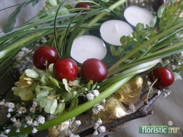Очень много " линейного материала" который придает композиции "беспокойство".....поэтому вишня и свечи с конфетами уравновешивают "истерику"! Продолжать в том же духе...то есть делай новые, и сюда! Молодец! |
