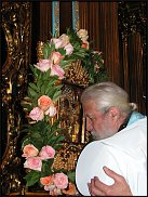 Как обещала, представляю свои работы с использованием горшечных растений. Это был эксперимент прошлого года как раз на Пасху. Возможно, это несколько непривычно для глаза (особенно оформление аналоя), но, как показала практика, такое оформление действидельно держится очень долго. В Соборе оно простояло до отдания праздника и наши женщины с удовольствием разобрали горшечные растения по домам. Фото 1,2,3. Здесь представлено оформление Аналоя. В основе всего - рамка с сеткой-рабицей со средним размером ячеек. Ее не очень хорошо видно, если будет нужно, я сфотографирую отдельно или схему нарисую. Использованы как срезаные растения так и горшечные. Срезаные цветы стоят в стеклянных пробирках с водой, которые вставлены в нужных местах в ячейки сетки. (такие стеклянные пробирки продаются и во флористических магазинах, но я покупаю в магазине технической и лабораторной посуды - там гораздо больше выбор). Горшечные растения, как цветущие, так и декоративно-лиственные, вынуты из горшков. Излишки земли я аккуратно, при помощи деревянной шпажки, чтобы не повредить корневую систему удаляю. Затем обворачиваю земляной ком увлажненным мхом и фиксирую его при помощи бульонки или обычных суровых ниток. Таким образом обработанные растения размещаются на рамке и фиксируются проволокой. При подсыхании мха, его нужно обильно опрыскивать из пульверизатора. В пробирки по мере необходимости так же добавляется вода. Таким образом, все растения получают необходимое питание и стоят достаточно долго. Естественно, что срезаные цветы увядают раньше, но я их просто заменяю и вся композиция остается декоративной в течении долгого времени. Вслучае, если какое-то горшечное растение чувствует себя неважно, его так же можно легко заменить. Фото 4,5,6 Здесь представлены работы для украшения икон в киотах. Композиции так же составлены и из срезаных цветов, и из горшечных. Составляются они следующим образом: емкость, размер которой подбирается по объему земляных комьев используемых горшечных растений, делится на несколко зон - для засадки с землей и для оазиса для срезаных цветов. Оазис замачивается, помещается в пленку (достаточно плотную), чтобы не было соприкосновения с землей (с чистым оазисом комфортнее работать) и помещается в емкость. Вокруг него размещают горшечные растения и уплотняют грунт как при обычной посадке горшечных растений. Если емкость не имеет слива, то желательно использовать дренаж. Композиционные нюансы соблюдаются так же, как при работе со срезаными цветами. Есть маленькая хитрость. В данных работах горшечные растения можно размещать не только в контейнер. Если обработать растение так же как в случае с аналоем и прикрепить к нему "ногу" , то его можно расположить в любой части работы. Важно!!! Так называемая "нога" должна быть обмотана мхом так же как земляной ком. Это позволяет растению получать дополнительную влагу из контейнера. Но его все же надо обязательно опрыскивать чаще, чем поливать основную композицию, т.к. земляной ком в данном случае пересыхает быстрее. Фото 7,8 - аналогичная работа на Рождество Для наших дорогих критиков хочу сразу пояснить, почему рамка сделана по размерам аналоя, а не иконы. Это сделано сознательно, т.к. у нас часто на аналой кладется сразу несколько святынь, и такое расположение цветов не мешает Батюшкам. http://orthod