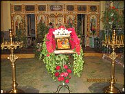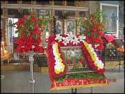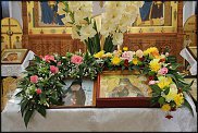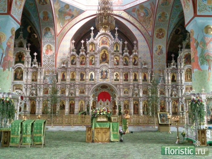 Да, Собор у нас действительно великолепный. Большой, просторный, потрясающей красоты фаянсовый иконостас... Но в этом-то и заключается вся трудность работы с цветами в этом Храме. Нет смысла делать что-то грандиозное по своим масштабам, потому что этого всего все равно не будет видно. Замысловатые орнаменты на иконостасе и киотах, богатейшая цветовая палитра, чудесные росписи - они сами по себе великолепны. Благочинный до сих пор не благословляет делать гирлянды для икон, расположенных на иконостасе и в киотах, чтобы прихожане могли налюбоваться этой красотой. А какую прекрасную икону Николая Чудотворца пожертвовал нам недавно один предприниматель, видели? Выкупил ее на свои средства из какой-то частной коллекции и вернул Храму. Спаси Господь его и его близких!!!