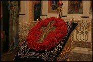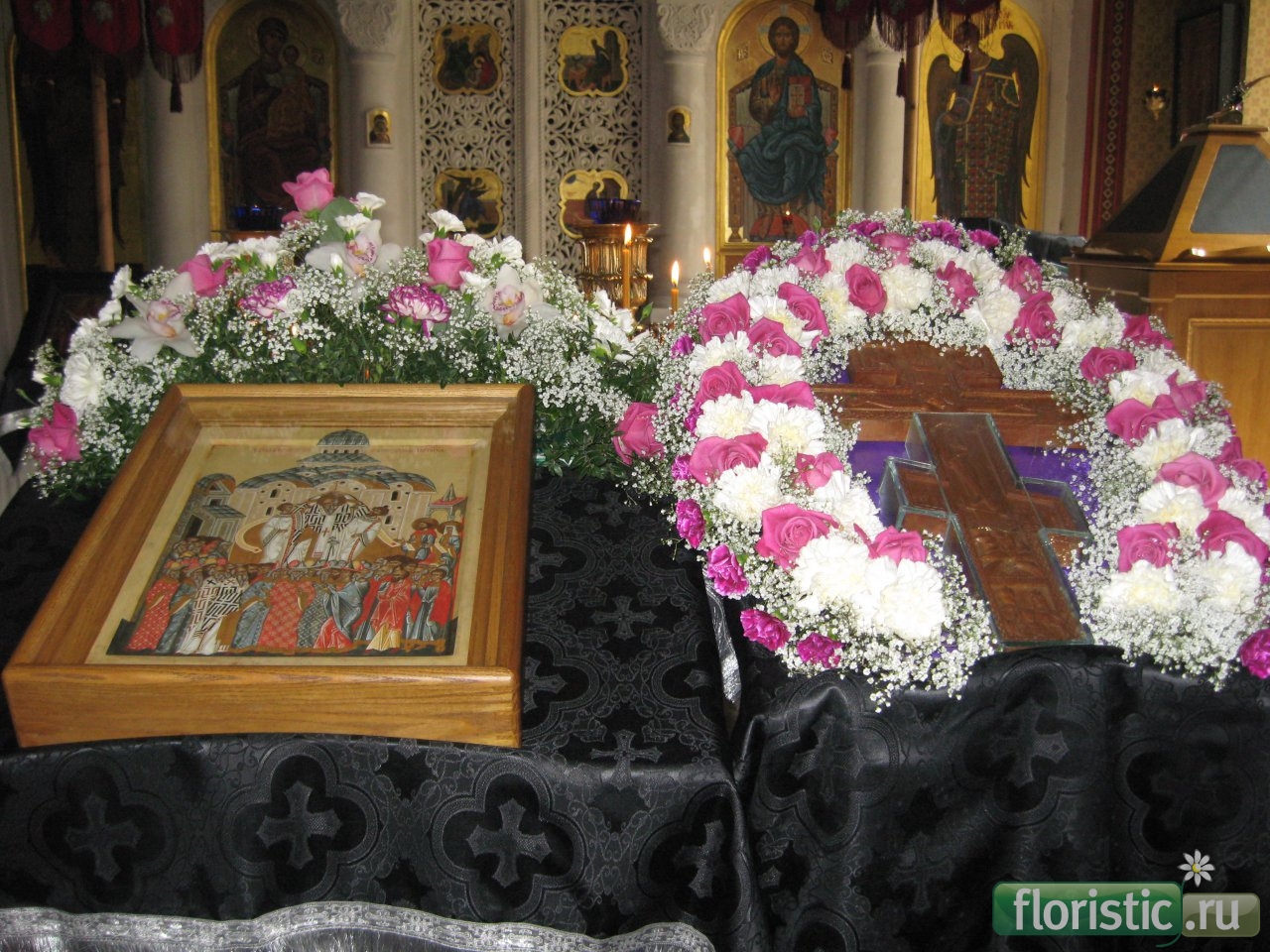 Елена, честное слово, у нас Крест украшался на основе, сделанной точно так же (хоть и не выглядит впечатляюще), и когда прикладываешься, мысли и ощущения исключительно благоговейные, а не о том, хватит ли сноровки добраться до святыни, однозначно не приходится подныривать под цветочные кущи и разгр***** их. Нет таких проблем. Крест находится вровень с цветами, и, по-моему, Процветший Крест такой и должен быть, иначе будет просто цветочная подложка.