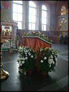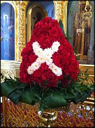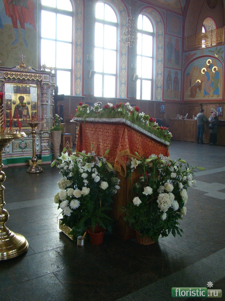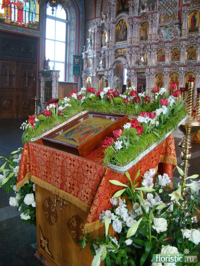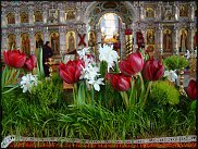 Пасха. В этом году сделали разное оформление. В церкви Сергия Радонежского в Алмазово и в Храме Ксении Петербуржской в Медвежьих Озерах - ярко красное с множеством оттенков (фото, к сожалению, не передает всей полноты красок, но подбор сортов в этом году был особенно удачным), а в Соборе Святой Троицы -с использованием пророщенной травы и весенних цветов. В Соборе в этом году решили расставить корзины от Плащаницы вокруг аналоя с иконой праздника.