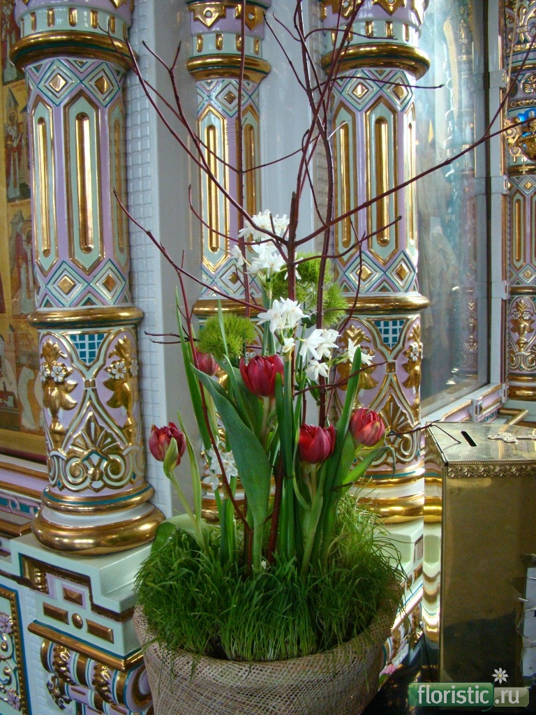 В этом году впервые оформляла Храм на Пасху, поэтому если есть недочеты -не судите строго. В композициях использовала крашенные белой краской ветви, которые после срезки у меня дома дня четыре сохли - так на них сейчас листочки распускаться начали в оазисе - чудо прямо.