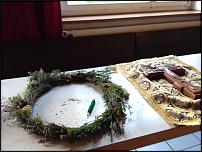 Ну да, просто декоративной проволокой прикрепила к каркасу и все...к субботе высохла, на треть уменьшившись и все, но каркас не оголила. Т.е., если на пиафлоь положить, то вообще видилжмо простоит пару недель. Я у входа вцерковь её посадила месяц назад в горшках на улице, она вымахала до полутораметра длинной, до самой земли, пришлось её подрезать. И композиция в горшке стала аккуратней и на праздник красота.