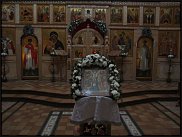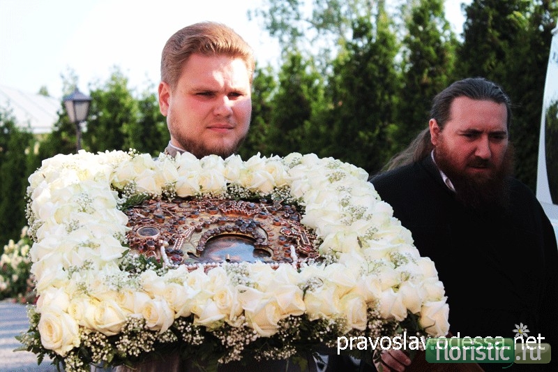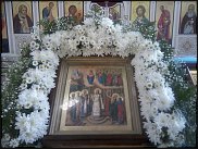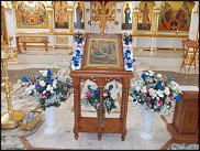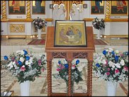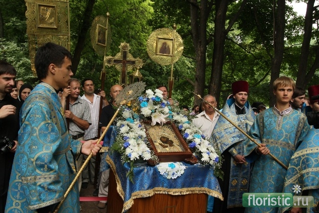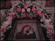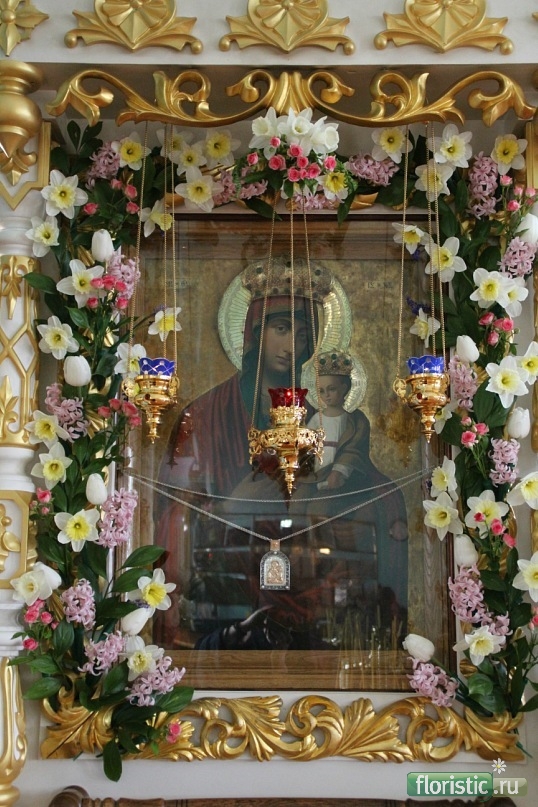 Украшают икону с особым, единственным в своем роде тщанием и благоговением, покрывая подвенечной фатой и живыми цветами. Трудно найти пример удачного и уместного единения живых цветов и рукотворных, но, по-моему, это как раз такой. |