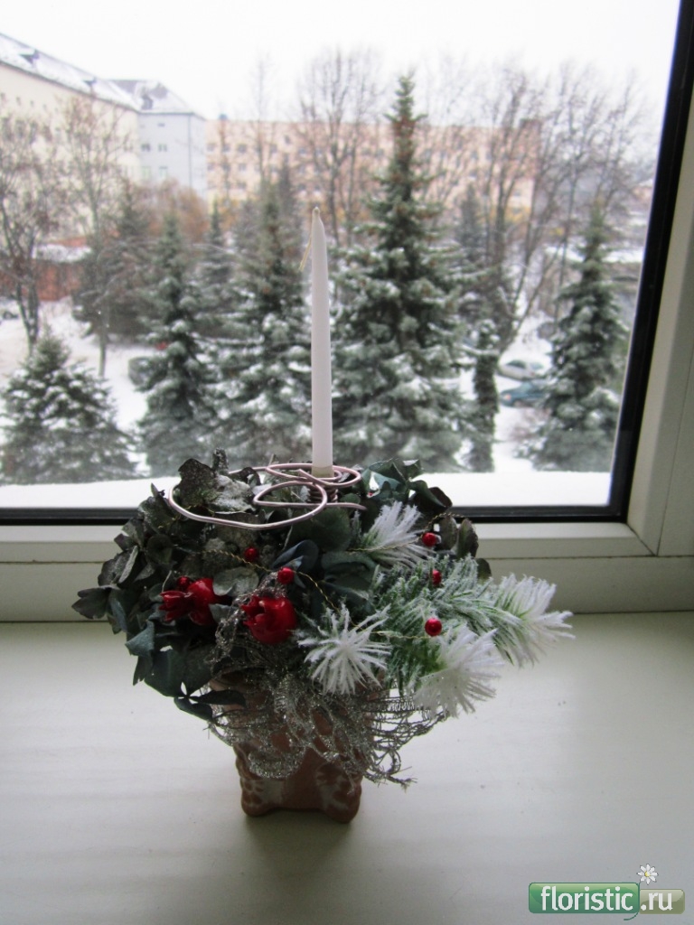 И, еще одна работа - очень маленькая миниатюра из искусственных веток и сухой гортензии - сделана для дежурных медсестер, когда муж лежал в больнице. Живые туда нельзя было. Сделала такую крохотулю (свеча высотой 12 см.))) Снимала в отделении, на фоне распрекрасных елей, растущих в больничном парке. ![]() ![]()