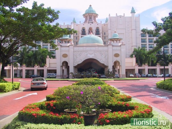 Действительно, очень красиво будут сочетаться с пальмами цветочные композиции в виде партера или арабески, но разработка и высадка на обьекте, такого плана цветника, очень сложная. Я думаю надо совместить белый(алисум,бегонию белую, маргаритку), красный(бегонию красную) и, действительно красиво и дорого выглядят окаймления из самшита, правда его нужно будет подстригать для эстетичности вида партера.