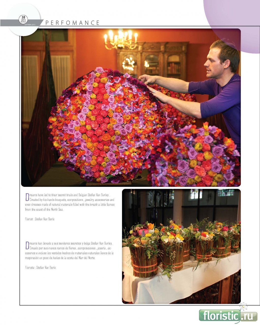 СЕНТЯБРЬ 2013/September 2013 Оформить подписку можно здесь: Подписка | World Floral Magazine P E R F O M A N C E Стефан Ван Берло Stefan Van Berlo Мечты привели на свои тайные тропы и бельгийца Стефана Ван Берло. Созданные его руками букеты, композиции, украшения, аксессуары и даже платья из природных материалов наполнены дыханием маленький фей с побережья Северного моря. |