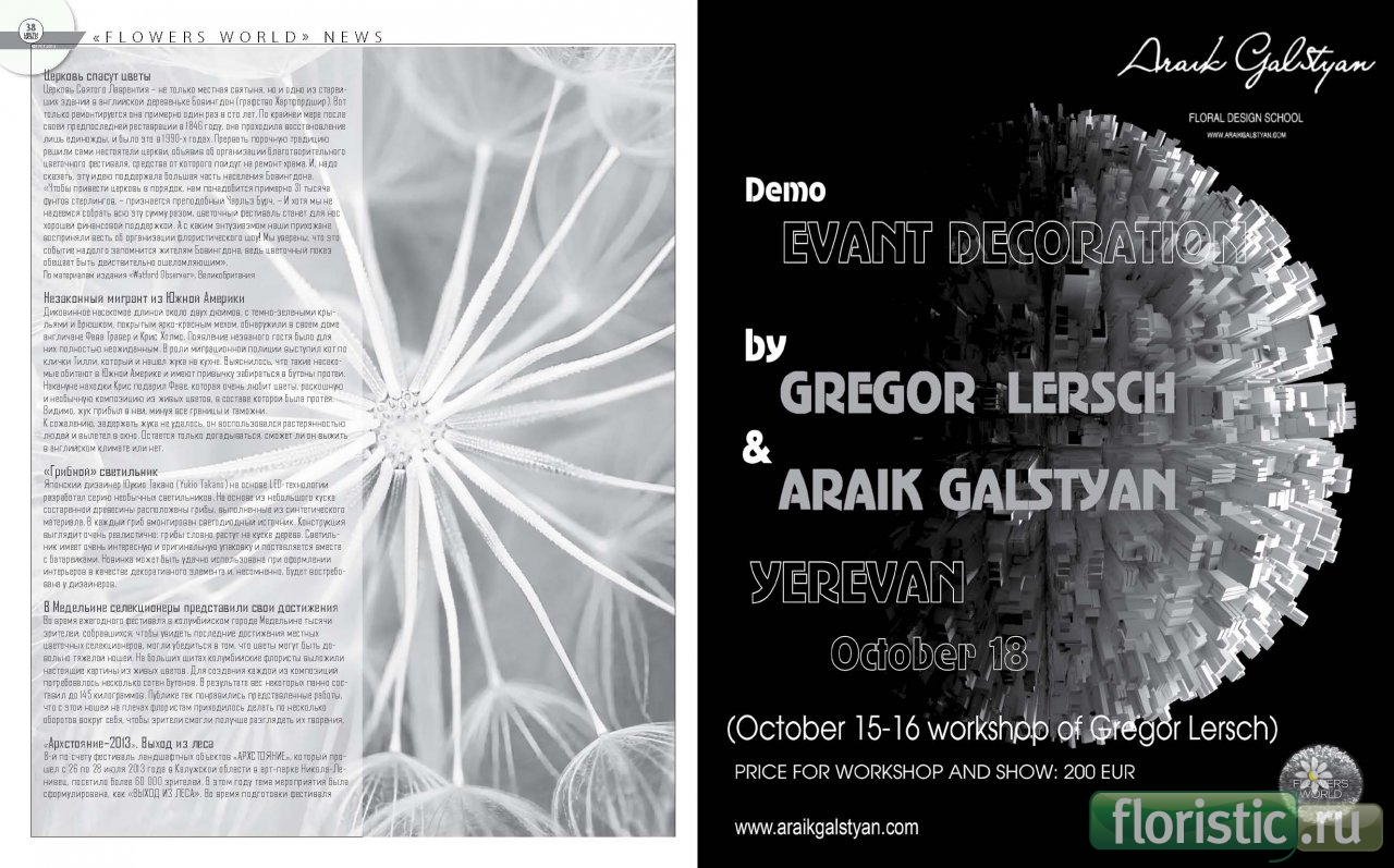 11-ого Сентября 2013 года в рамках Международной выставки цветов Крокус-expo «FLOWERS Expo– 2013» состоится Ежегодный Показ Цветочного Мира «ДЕНЬ ВЫСОКОЙ ФЛОРИСТИКИ » / Annual World Flower Show «A DAY OF TOP FLORAL DESIGN» , в котором примут участие всемирно известные флористы-дизайнеры. На спецально возведенную для показа сцену выйдут (имена в алфавитном порядке): Араик Галстян (Araik Galstyan) – Россия; Даниэль Сантамария (Daniel Santamaria) – Испания; Жиль Бойяр (Gil Boyard) – Франция; Наташа Лисица (Natasha Lisitsa) –США; Стефан Ван Берло (Stefan Van Berlo)-Бельгия. Каждый из флористов-дизайнеров проводит свой собственный практический семинар и демонстрацию на сцене. А также выступит группа мастеров-флористов ARAIK GALSTYAN MOSCOW INTERNATIONAL FLORAL DESIGN SCHOOL SKOLKOVO. Организатором показа A Day of Top Floral Design выступает Московская международная школа флористического дизайна Араика Галстяна и журнал «Цветы WORLD». Показ A Day Days of Top Floral Design обещает стать одним из самых ярких и запоминающихся событий года.