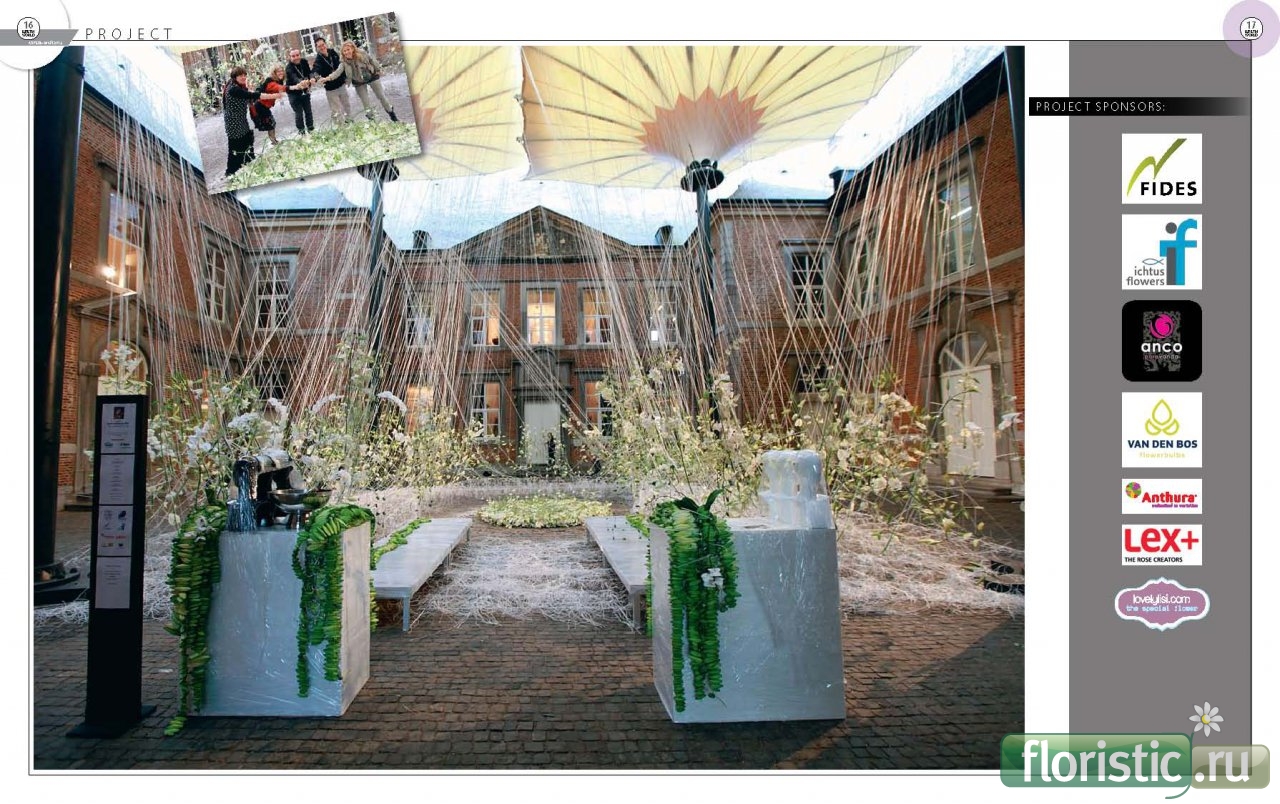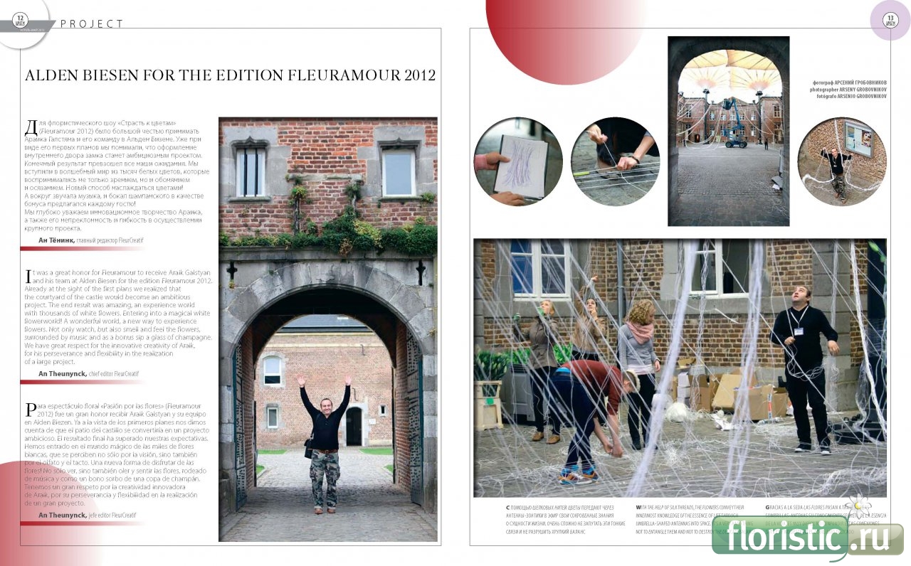 Для флористического шоу «Страсть к цветам» (Fleuramour 2012) было большой честью принимать Араика Галстяна и его команду в Альден Бизене. Уже при виде его первых планов мы понимали, что оформление внутреннего двора замка станет амбициозным проектом. Конечный результат превзошел все наши ожидания. Мы вступили в волшебный мир из тысяч белых цветов, которые воспринимались не только зрением, но и обонянием и осязанием. Новый способ наслаждаться цветами! А вокруг звучала музыка, и бокал шампанского в качестве бонуса предлагался каждому гостю! Мы глубоко уважаем инновационное творчество Араика, а также его непреклонность и гибкость в осуществлении крупного проекта. Ан Тёнинк, главный редактор FleurCreatif Контактная информация: Сайт: ЦВЕТЫ WORLD ARAIK GALSTYAN Moscow International Floral Design School |