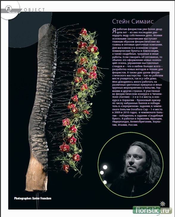 (июнь-июль 2013 г.). Стейн Симаис Я работаю флористом уже более двадцати лет – из них последние двенадцать веду собственное дело. Моими основными заказчиками выступают главным образом флористические магазины и оптовые цветочные компании. Для магазинов я в основном создаю коммерческие букеты и композиции, а также свадебные, траурные и иные работы. если говорить об оптовиках, то обычно это оформление новых коллекций сезона, украшение выставочных стендов и – что я люблю больше всего –разработка новых методов и техник для флористов. Я также даю уроки флористического мастерства – как на рабочем месте учащегося, так и у себя дома. Мне доводилось много работать на различных цветочных ярмарках и иных крупных мероприятиях в Бельгии, Германии и других странах. Я участвовал во флористическом конкурсе в Чичели-Холл (Англия) – 2-е и 3-е места; в конкурсе в Хорватии – бронзовый призер по числу набранных баллов и победитель в «сюрпризном» задании; в чемпионате Бельгии doraflora Cup – 1-е место в 2009 и 2010 годах; в чемпионате Бельгии – победитель в задании «Свадебный букет». Я работал в Германии, Франции, Нидерландах, Великобритании, Хорватии, Италии, России. Stijn Simaeys I have been w orking for over 20 y ears as a f lorist, the las t 12 y ears on a freelancebase mostly for f lower shops, whole salers. The work I do in the f lower shops is mainly flower de signs meant to be sold, bu t also pieces for wedding s, funerals, fe stivities, etc. For the whole salers usual ly I do the decoration for the ne w col lections of the season, decorate for f airs, and – what I lik e the most – de veloping ne w thing s as base s and other decorations for f lorists. Flo wer le ssons are given as wel l on location or in m y place. I also did dif ferent participations to f airs and bigger e vents. R ecently I ended second and third in the conte st at Chichele y Hal l (England). In Split (Croatia) I got third place over - all and was the winner of the sur prise theme. The Doraflora Cup in Belgium was w on by me in 20 10 and 2009. I competited t wice for the Belgian Championship and w on the «W edding Bouquet» the me. I w orked in foreign countries: Germany, France, Hol land, UK , Croatia, Poland, Italy, Russia. Photographer: Xavier Francken |