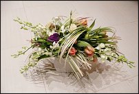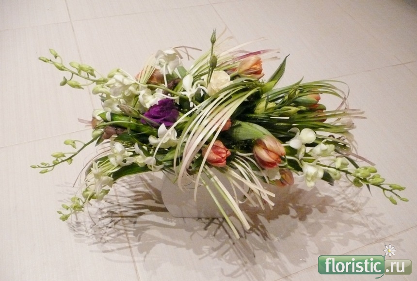 При использовании веток дендробиума в букете,нижние цветы почти всегда оказываются в глубине букета,заминаются и совершенно не работают,мне понравился вариант Р.Зарубина который показывался в "7 цветах",когда дендробиум ставился в пробирки прикрепленные к каркасу,у меня вот так получилось