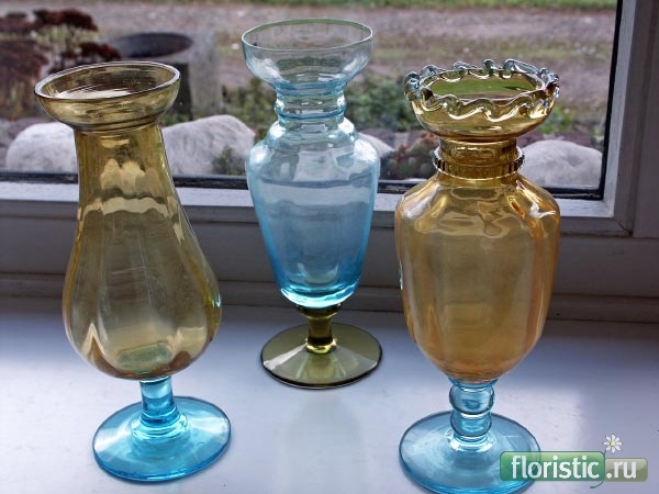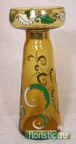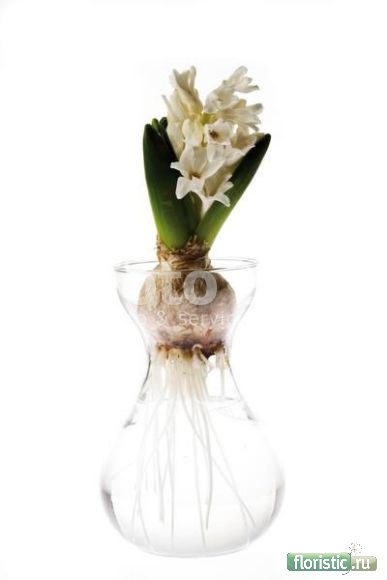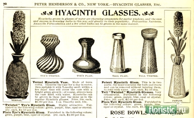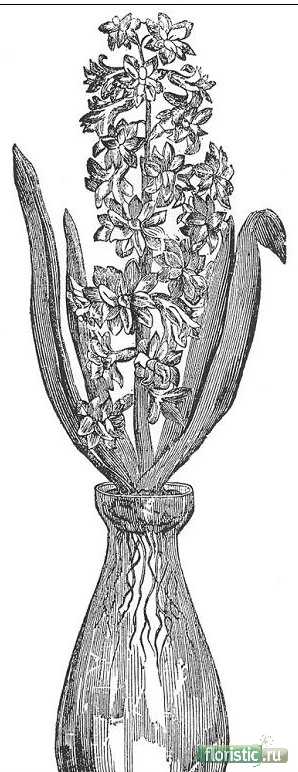 В Германии во второй половине 18 века в Берлине прошла первая выставка гиацинтов, после которой многие с увлечением и энтузиазмом занялись их разведением. На полях садовода Давида Буше (потомка французских эмигрантов) цвело до 5 млн. гиацинтов одновременно. Сам король Фридрих Вильгельм Третий бывал у него частым гостем. Французы пошли дальше, эстетизировав выгонку гиацинтов в воде. Изготовливались специальные стеклянные бокалы для гиацинтов. Но самой необычной была выгонка в двойных бокалах. Сосуд состоял из двух частей - нижней прозрачной и верхней. Две луковицы сажались в верхнюю тюльпанообразную часть донце к донцу; в нижнюю часть наливалась вода. Нижняя луковица росла и цвела вверх корнями прямо в воде. Получался эффект отражения (использованы материалы книги М.Гесдёрфера "Комнатное садоводство" и журнала "В мире растений" 3-4 за 1999 год). |