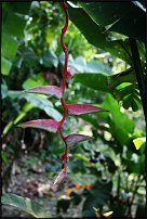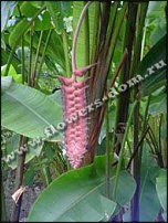 Карибы. Многолетнее растение высотой до 2,5м. Прямой стебель,находящийся в футляре из старых листьев. Продолговатые заостренные бананообразные темно-зеленые блестящие листья. Белые цветки,заключенные в ярко-красные кроющие листья до 2м длиной.