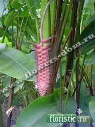 Тропическая Америка. Многолетнее растение высотой до 4м. Прямой стебель,находящийся в футляре из старых листьев. Продолговатые заостренные бананообразные ярко-зеленые листья с темно-красной нижней поверхностью. Мелкие цветки,заключенные в красные и желтые кроющие листья до 60см длиной.