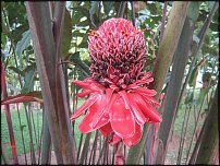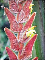 Многолетник 0,5-1,5 м высотой. Соцветие прямостоячее с 4-5 двурядными прицветниками, красными или красно-оранжевыми и с желто-золотистыми основаниями и кончиками. Чашелистики оранжевые периферические.