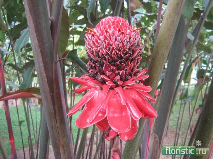Многолетнее растение 1,8-2,4 м высотой с прямым стеблем, окутанным влагалищами старых листьев. Листья длинночерешковые, крупные, бананоподобные, широко овальные, на конце немного заостренные, с густо расположенными параллельными боковыми жилками, светло-зеленые, снизу еще светлее, плотные. Прямое соцветие с 4-5 темно-красными с ярко-желтыми, золотистыми кончиками двурядными прицветниками, внизу со щеками и килем, широкой губой.