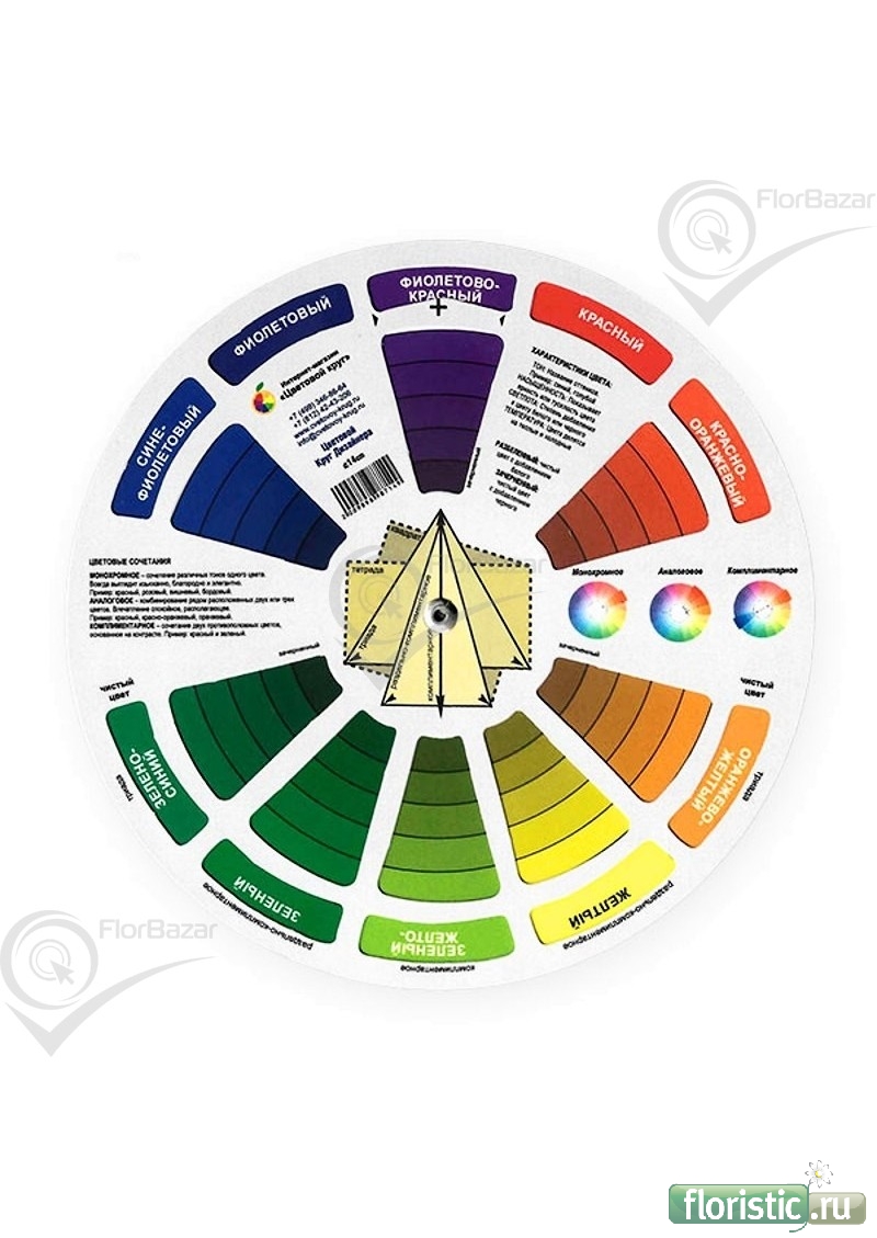 !!! НОВИНКА !!! Цветовой круг Иттена на 144 цвета с приложениями Первая сторона – 12 секторов. Чистый цвет + 5 оттенков от чистого к разбелённому Вторая сторона – 12 секторов. Чистый цвет + 5 оттенков от чистого к зачернённому Приложение №1 Основы цветоведения. Первичные цвета. Вторичные цвета. Переходные цвета. Тёплые/холодные цвета. Оттенки/тона/тени. Таблица-шпаргалка по сочетанию цветов. 95 цветовых сочетаний из 12 основных цветов по 8-ми цветовым схемам цветового круга Иттена. Все цветовые сочетания изображены на фоне основного цвета. Приложение №2 Список широко распространённых цветов. 207 цветов и их оттенков. Названия и цифровая кодировка. Таблица-гид по смешиванию цветов. На горизонтальной оси расположены 18 цветов с названиями на русском языке. По вертикальной оси - те же 18 цветов на английском. На пересечении выбранных исходных цветов показано их цветовое смешение. Всего 324 результата смешивания. Диаметр 14 см. Быстрая ссылка в интернет магазин - Цветовой круг Иттена на 144 цвета www.florbazar.com.ua Интернет магазин для флористов и декораторов |