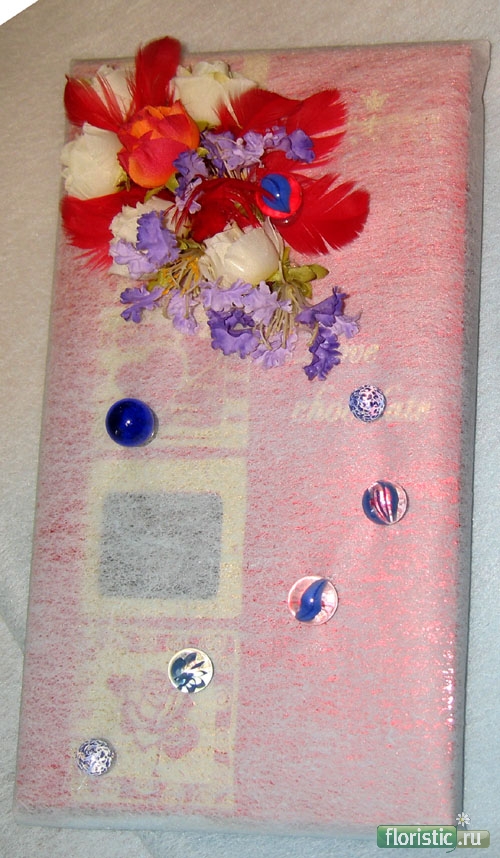 Привет! А у меня была такая забавная ситуация. Пришел постоянный клиент и попросил упаковать подарок - коробку конфет и кольцо. Причем обязательно так, чтобы подарок выглядел так, как будто это просто запакованная коробка конфет в полупрозрачный материал, и чтобы на нем были цветы, а в этих цветах спрятано кольцо) В-общем, задал задачку! И ведь это кольцо не приклеешь (это было довольно дорогое кольцо), на слишком тонкую проволку или бульончик не прикрепишь (боишься, а вдруг оторвется и потеряется), на толстую проволоку или ленту тоже - будет грубо смотреться и будет заметно. Вот что я сделала - приклеела искусственные белые розочки головками к упаковке (фетр) (цветы он сам выбирал, и стеклянные шарики - марблсы тоже сам выбирал - под цвет камня в кольце, там был голубой сапфир), а оранжевую розу приклеела на ножке. На ножку розы одела колечко. И сам бутон с ножки снимается, если розочку отогнуть потянуть, хотя сам по себе хорошо держится. А чтобы кольца не было видно, задекорировала вокруг перышками и сиреневыми цветочками. Вот так. Честно говоря клиент все время заходил в дизайнерскую и проверял работу, потому что для него этот подарок был очень важен и он волновался, и я учитывала любую его просьбу на счет оформления. Практически мы сделали эту работу вместе. Вот такой случай. И вот фотка того что получилось. Ну что, не видно кольцо? :D