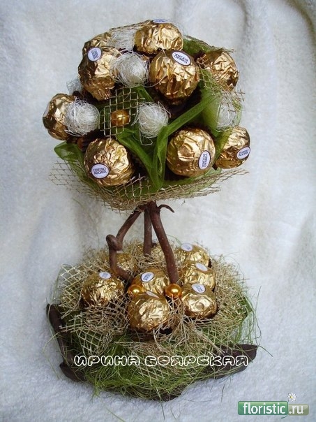 Спасибо. В центре готовый искусственный цветок , добавила туда брошь . Цветы с конфетами собраны из отдельных лепестков . Ну и груши.