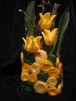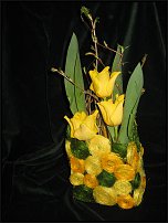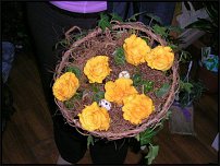 Я новенькая, так что не судите строго...решила поделится идеей к пасхальной и вообще весенней композиции...из сизаля скатываются кружки, желательно разного размера, помещаются на пленку, поливаются клеем ПВА , накрываются второй пленкой и оставляются высыхать еще дня 2-3.Потом все лишнее обрезается, берется оазис, кладется в полиэтиленовый пакет, можно обработать цветными лентами или бумагой, приклеиваются кружочки из сизаля (друг к другу, так аккуратнее),в оазис вставляются цветы, листья и распустившиеся веточки...:pвот и все...извините за плохое качество фоток |