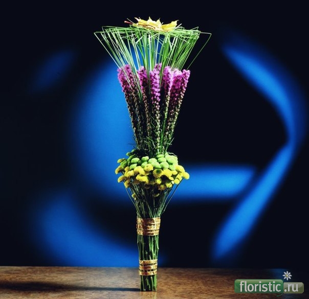 Мужские вертикальные букеты в основном собираются в параллельной технике. Вертикальные и односторонние букеты относятся к траурной флористике, еще их называют букетами на возложение. Если вы собираете вертикальный букет в спиральной технике на подарок, то такой букет должен быть всесторонним. Представьте, что обычный спиралевидный круглый букет вытянули за середину в верх. Получим "цветочную" пирамидку)))))))))) |
