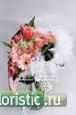 Каркас из плотного картона, окручен розовой лентой, приклеены бусы-нити и боа с одной стороны. Цветы в основном весенние. Плотный такой букет, очень красивый получился, сама не ожидала:eek: Извините, что в банке, - вазу не нашла просто,:D |