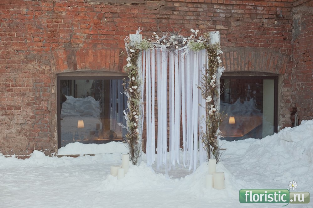 Нет, фон специально захочешь - такой не выберешь! Этот фон - вынужденные обстоятельства. Это такой двор внутренний возле кафе, площадка, на которой проходила регистрация. Расчистили от сугробов чуть-чуть, снег, кстати, еще пригодся для дополнительного декора и укрепления арки... Было 19 января... Бррр... Вспоминать жутко! |