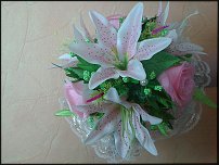 Я делала композицию на оазисе, добавляла аквилегию, правда махровую, цветочки, которые распустились раньше, могут опасть, но остается приятного цвета и формы шишечка. Торжественный день цветок выдерживает.