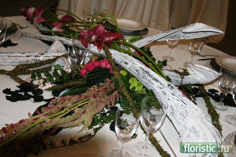 Второй вариант - плейсменты под тарелками из натуральной соломки,крашеной в белый цвет,в тему - куски коры,крашеные белой краской. И хвост амаранта...)))Официанты - необходимое условие такого оформления.