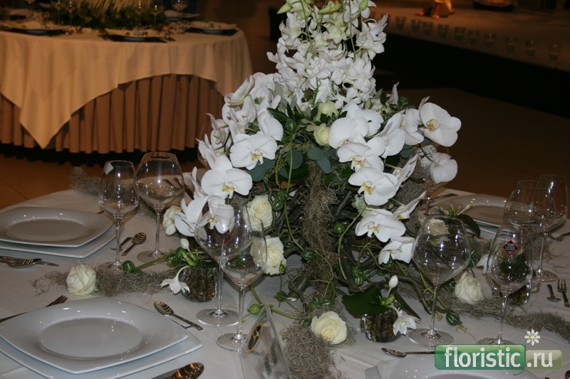 Пирамида из белых орхидей. На мой вкус - высоковато и будет мешать,но есть клиенты,которое низкое оформление центра стола не понимают. Может быть,пригодится...